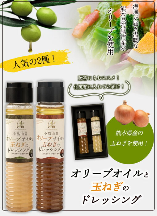 商品情報 荒尾市産オリーブオイル使用の玉ねぎドレッシング 2本セット 名称 ドレッシング 産地 熊本県 荒尾市産 原材料名 【元味】玉ねぎ(熊本県産)、食用植物油脂(食用オリーブ油(熊本県荒尾市産)、食用なたね油)、りんご酢、砂糖、白ワイン、食塩、生姜、にんにく、粗挽き黒胡椒 【和風】玉ねぎ(熊本県産)、食用植物油脂(食用オリーブ油(熊本県荒尾市産)、食用なたね油)、りんご酢、醤油(大豆・小麦を含む)、砂糖、食塩、生姜、にんにく 内容量 190ml×2本 賞味期限 ラベルに記載 保存方法 直射日光を避け、常温で保存してください。