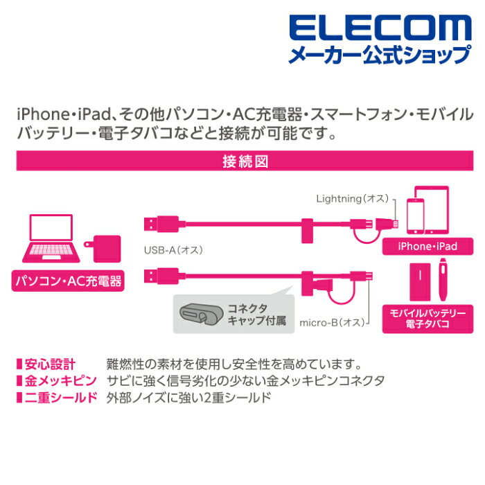 ■コネクタ形状1:Lightning(オス)-USB micro-B(メス)■コネクタ形状2:USB micro-B(オス)-USB A(オス)■長さ:0.7m ※コネクター含まず■使用目的・用途:USB A端子を持つパソコン及びAC充電器とLightning端子を搭載したiPhone,iPad,iPod、又はmicro-B端子を搭載したスマートフォン、タブレットを接続し、充電・データ通信が可能です。