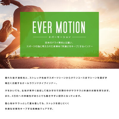 日本製 エバーモーション EVER MOTION Tシャツ メンズ 男性用 大人 半袖 ショートスリーブ スポーツインナー インナーウェア ゴルフウェア フィットネスウェア テニスウェア ジムウェア エクササイズウェア アンダーシャツ アンダーウェア トレーニングウェア スポーツウェア コンプレッションインナー コンプレッションウェア マリンウェア 水着 水着素材 水着生地 Made in Japan 吸汗速乾 伸縮 伸縮素材 DRY速乾 速乾 ストレッチ クイックドライ フィット UVカット 体型カバー ベタつかない 日焼け対策 紫外線カット 日焼け防止 紫外線対策 快適 超快適 さらさら サラサラ ドライ ヒンヤリ 冷え予防 冷え対策 ケガ対策 ケガ 春 夏 秋 冬 オールシーズン スポーツ テニス ゴルフ ヨガ フィットネス ジム トレーニング ウォーキング ジョギング サイクリング 自転車 サッカー 野球 バイク アウトドア お出かけ 通勤 通学 タウン 釣り フィッシング ハイキング トレイル関連商品 →長袖はこちら →ショートパンツはこちら →ロングパンツはこちら 商品内容 EVER MOTION(エバーモーション)半袖 商品説明 優れた吸汗速乾性と、ストレッチ性能でスポーツシーンからタウンユースまでシーンを選ばず幅広く活躍するオールラウンドタイプインナー。