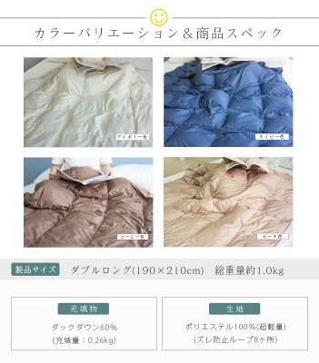 羽毛肌掛け布団のご紹介 サイズ 190×210cm(ダブル) 詰め物 ホワイトダックダウン60% 詰め物重量:0.26キロ 生地 ポリエステル100%(超軽量タイプ) 製法 ループ8ヶ所/パイピング付2本針縫製/細かいキルト 洗濯可否 ご家庭で丸洗いOK 匂いについて 適切な洗浄を実施した羽毛を使用しておりますが、動物由来の素材である羽毛は完全に無臭にはなりません。