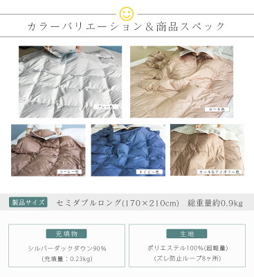 羽毛肌掛け布団のご紹介 サイズ 170×210cm(セミダブル) 詰め物 シルバーダックダウン90% 詰め物重量:0.23キロ 生地 ポリエステル100%(超軽量タイプ) 製法 ループ8ヶ所/パイピング付2本針縫製/細かいキルト 洗濯可否 ご家庭で丸洗いOK 匂いについて 適切な洗浄を実施した羽毛を使用しておりますが、動物由来の素材である羽毛は完全に無臭にはなりません。