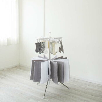 ■商品サイズ(cm)本体:直径約84×高さ約125収納時:直径約18×高さ約160■重量約1.9kg■材質ステンレス巻きスチールパイプ、ポリプロピレン■耐荷重(約)全体6kg、ピンチハンガー部2kg、タオルハンガー部4kg■一度に干せる目安タオル16枚、小物24枚省スペースでもしっかり干せるパラソル物干しです。