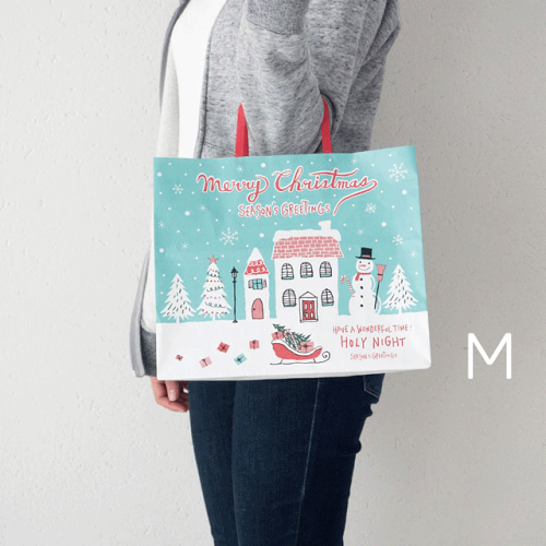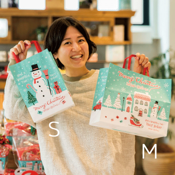 商品説明ミントブルーと可愛いスノーマンが目を引くクリスマスデザインのペーパーバッグ。